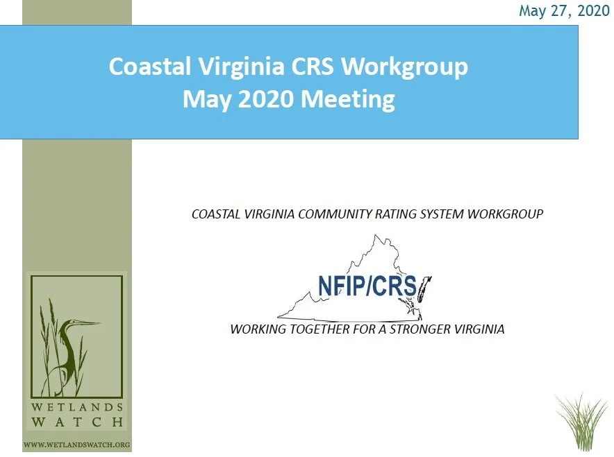 July 2020: The Coastal VA CRS Workgroup was hosted online in response to the COVID-19 quarantine/social distancing measures in Virginia. Our meeting included three presentations. (1) Ashley Gordon from the Hampton Roads Planning District Commission (HRPDC) presented on a potential regional CRS credit (Activity 350) opportunity, utilizing the regional elevation certificate inventory managed by the HRPDC. (2) Richard Sobato and Sarah Wolfe from FEMA Region III attended the Workgroup meeting to respond to the CRS Workgroup’s letter requesting information and clarity from FEMA regarding minus-rated policies lists. (3) Wetlands Watch’s Executive Director, Skip Stiles, presented on the new Virginia Community Flood Preparedness Fund. Formerly the Virginia Shoreline Resiliency Fund, the new Fund was established via HB 981 as Virginia joined the Regional Greenhouse Gas Initiative (RGGI), a market-based compact among New England and Mid-Atlantic states to reduce carbon dioxide emissions. Money generated through RGGI will flow into the Flood Fund - potentially $45 million each year! Download the PowerPoint presentation from the meeting HERE. You can read the Zoom chat text and watch a recording of the meeting.